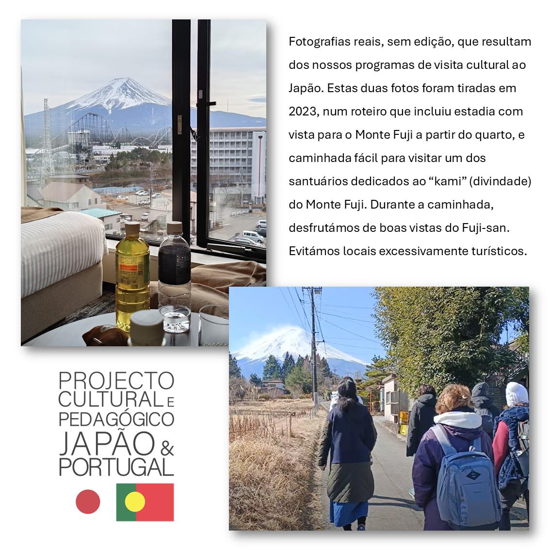 Ao todo, o nosso programa no Japão corresponde a 10 dias. Todos os dias têm programação de itinerário com acompanhamento e visitas guiadas em português. O nosso programa não é uma proposta de turismo e não se deve confundir ou comparar com a oferta comercial de agências de viagens, já que não usamos esses serviços e realizamos a criação do itinerário, o planeamento, a logística, a execução, e o acompanhamento em regime sem fins lucrativos.