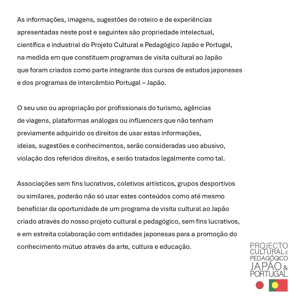 Não ser um profissional das viagens e turismo, não ser um profissional “influencer” ou similar, e não fazer uso abusivo da nossa oferta e oportunidade enquanto organização sem fins lucrativos dedicada à educação, arte e cultura, e aceitar e assinar os nossos termos, de forma a proteger a privacidade dos outros participantes, dos membros da organização e do proj-japaoeportugal.org.