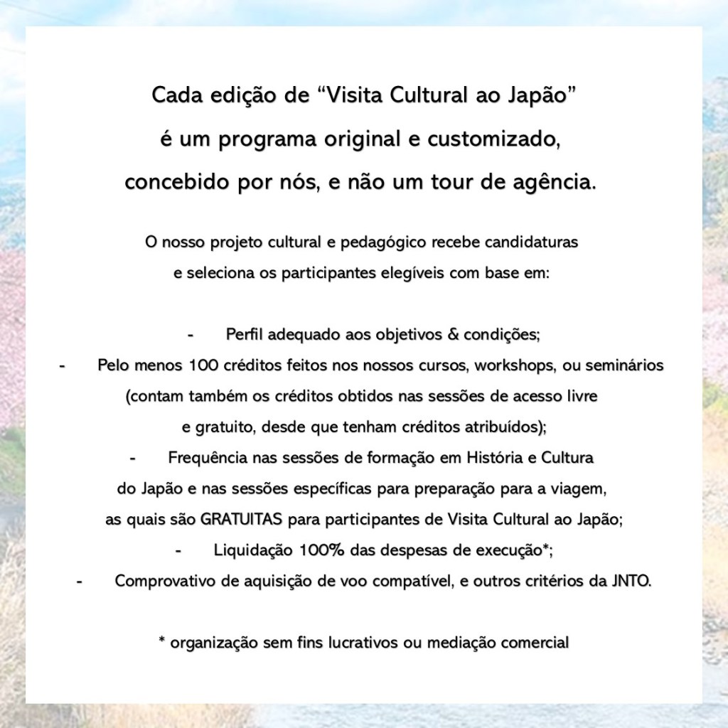 Esta sessão é especialmente indicada para os que vão participar nos programas de Visita Cultural ao Japão + Coreia em Abril de 2026 (grupo já está fechado), mas podem também participar todos aqueles que se interessem pelo tema.