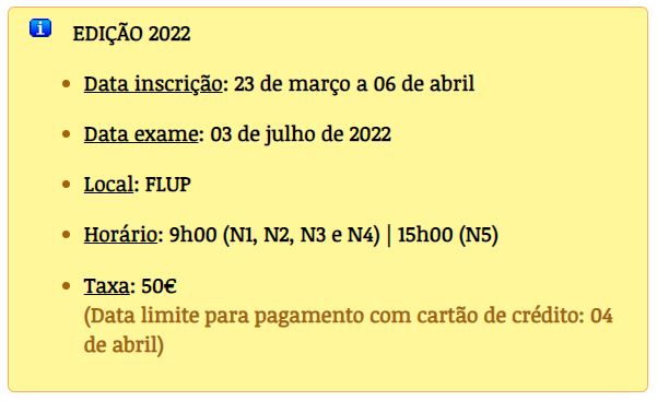 R.: Recomendamos que visite o website da Embaixada do Japão em Portugal, que é a representação oficial do Governo do Japão. (link: https://www.pt.emb-japan.go.jp/itpr_pt/00_JLPT2019.html ) Também pode visitar o website da Faculdade de Letras da Universidade do Porto, na secção onde apresentam o que é o JLPT (link: https://sigarra.up.pt/flup/pt/web_base.gera_pagina?p_pagina=1021530 ).