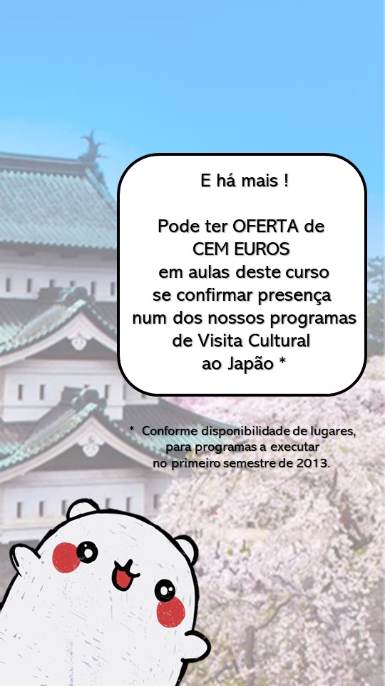 Esta oferta é efetiva desde que o viajante tenha plenamente liquidado as despesas de execução do programa (naturalmente, depois de se verificar que há disponibilidade de lugar e adequação do viajante aos termos do programa) e na condição de ter ainda tempo para frequentar as aulas antes da viagem. Portanto, para quem desejar visitar o Japão no programa de 26 de Março a 6 de Abril – que tem neste momento 3 (três) vagas – é uma oportunidade perfeita.