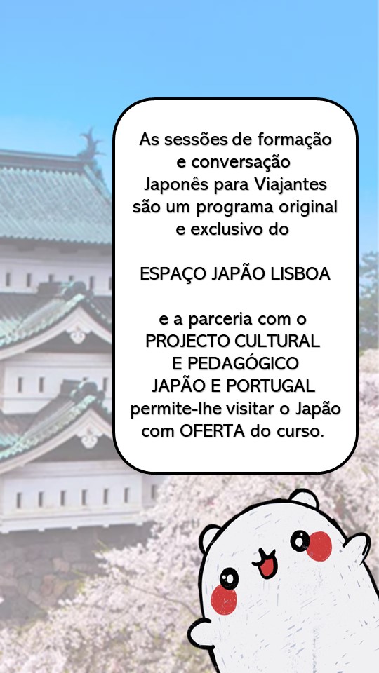 Em parceria com o Espaço Japão Lisboa, o nosso Projeto Cultural e Pedagógico vai oferecer a formação em língua japonesa para viajantes, com o plafond máximo de 100 (cem ) euros em aulas, desde que o beneficiário dessas aulas confirme integração num dos nossos programas de Visita Cultural ao Japão a realizar no primeiro semestre de 2023.
