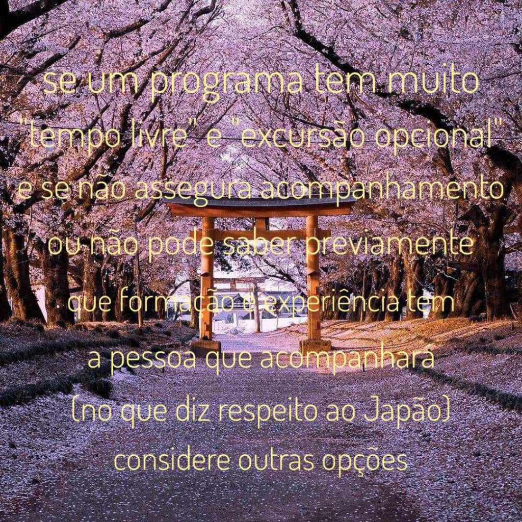 O Japão não é um destino como os outros. Provavelmente o mesmo poderia dizer-se de outros lugares, mas nós aqui no Projecto definimo-nos pelo compromisso de nos dedicarmos a apresentar o Japão e os Estudos Japoneses aos portugueses, assim como também apresentamos Portugal e os Estudos Portugueses aos japoneses. Portanto, o que está na nossa capacidade é esclarecer que uma visita ao Japão deverá ser sempre abordada como uma visita ao Japão, e portanto um operador turístico que tenha muita experiência em geral pode ainda assim não ser o ideal para o Japão, bem como um operador turístico que se defina como especializado no Japão mas de recente constituição e nula ou quase nula experiência (considerando que não pode operar entre 2020 e 2023) também não lhe poderá dar segurança alguma.