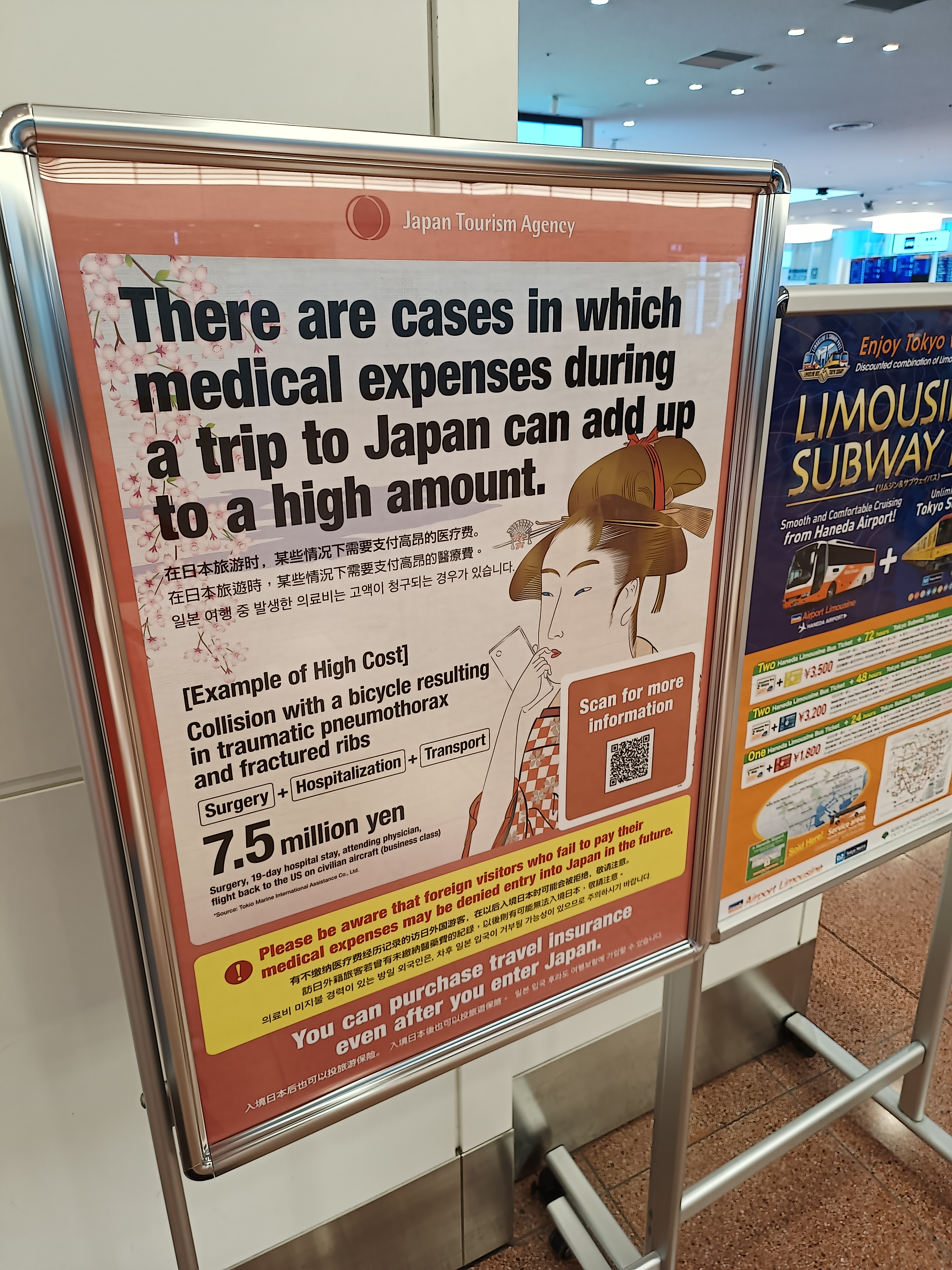 Fotografado no aeroporto de Narita, à chegada, no sector dos voos internacionais, para aviso dos visitantes estrangeiros. Para referência, no câmbio atual, o valor de 7,5 milhões de yenes é superior a 45 mil euros. A não liquidação de uma despesa médica é crime no Japão, pelo que o estatuto do visto é revogado e a saída do país não é possível. O infractor deverá passar pelo sistema legal japonês antes de poder solicitar autorização de saída do país. Outras circunstâncias que tamb~em são criminalizadas e que podem ser surpresa para turistas estrangeiros são: fotografar menores de idade (mesmo se for na rua), comprar e consumir bebidas alcoolicas se for menor de 20 anos de idade (mesmo que tenha mais de 18), danificar propriedade de estabelecimentos de alojamento e restauração como por exemplo andando de sapatos no interior do estabelecimento e/ou por cima do pavimento de tatami (palhinha), etc.